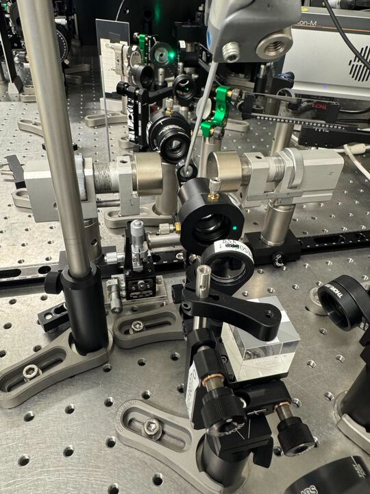 Durch optisches Pumpen wird eine beträchtliche Anzahl kohärenter Magnonen angeregt, die sich wiederum als Larmor-Präzession der antiferromagnetischen Magnetisierung in Nickeloxid bemerkbar machen (siehe Kreis in der linken Abbildung). Diese präzedierende Magnetisierung verschiebt aufgrund der relativistischen Spin-Bahn-Kopplung die elektronischen Niveaus in den Nickelionen. Diese Verschiebungen verändern wiederum die optischen Übergangsfrequenzen geringfügig, sodass die Transmittanz periodisch moduliert wird. Mit Hilfe der hochmodernen Anlage (siehe rechte Abbildung) im Bossini-Labor in Konstanz konnten diese Modulationen nachgewiesen werden. Die Verschiebungen der Übergangsfrequenzen wurden von Priv.-Doz. Jörg Bünemann in Dortmund berechnet. Das bahnbrechende Ergebnis, das die enge Wechselwirkung zwischen magnetischen und elektronischen Anregungen zeigt, wurde somit durch die umfassende Nutzung der Synergie zwischen Experiment und Theorie ermöglicht.